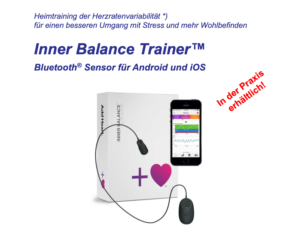 Neu bieten wir in unserer Praxis den Inner Balance Trainer™ zum Verkauf an, mit welchem die Herzratenvariabilität (HRV) zu Hause trainiert werden kann. Eine höhere HRV geht einher mit einem gesunden Herzen, besserer Stressbewältigung, mehr Wohlbefinden und damit höherer Lebensqualität.