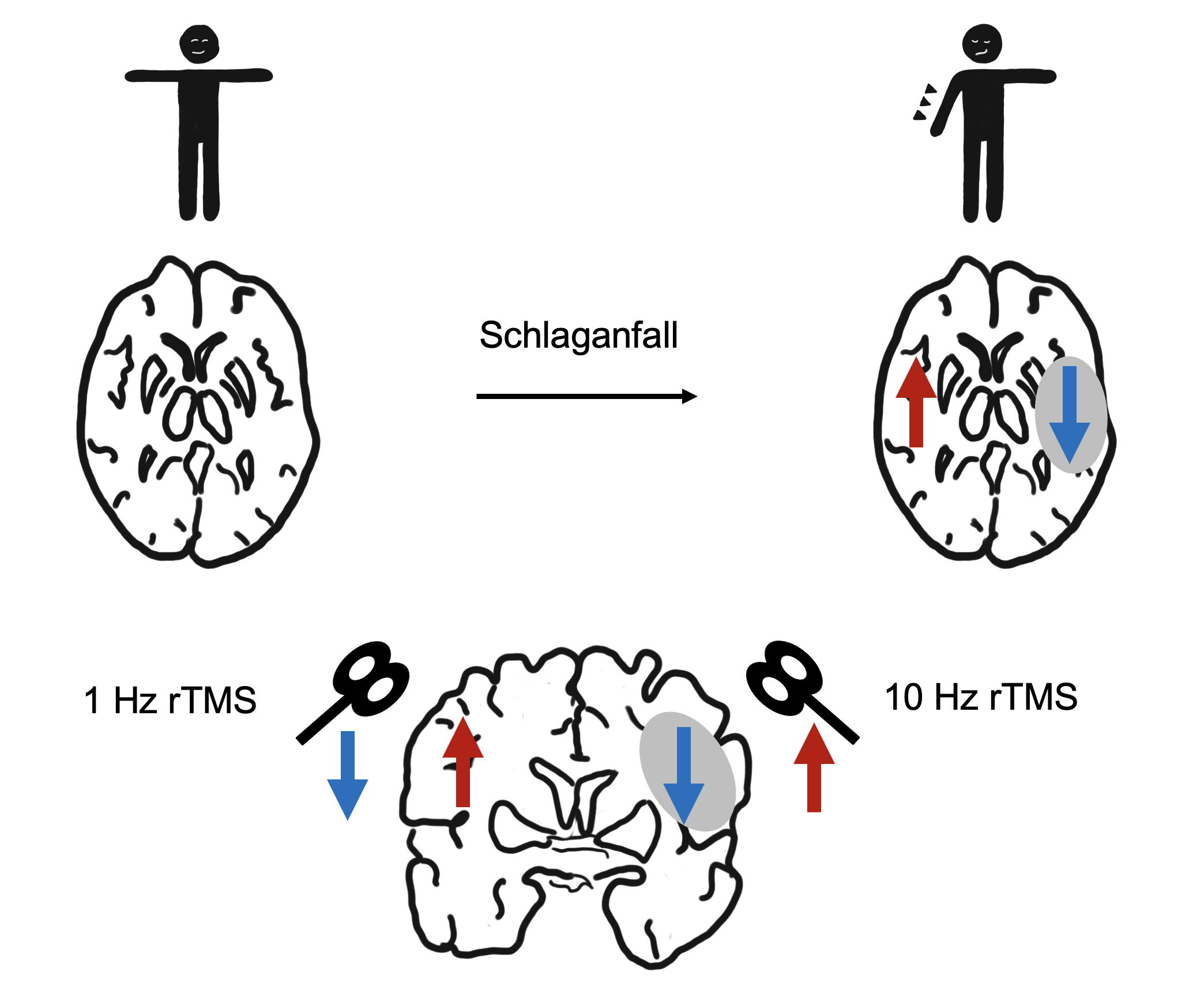 Erfolgen die magnetischen Impulse regelmäßig jede Sekunde, wird die Aktivität der Grosshirnrinde gehemmt. Durch die Hemmung der gesunden Seite kann wiederum die Hemmung der verletzten Seite reduziert werden.